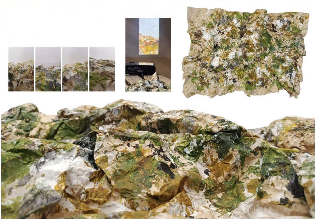 La Comté, peinture acrylique sur papier kraft puis froissé et vidéoprojection, vidéo 4’23 / https://www.youtube.com/watch?v=MgfsdDv8E-g