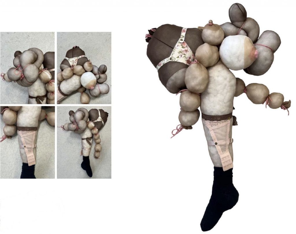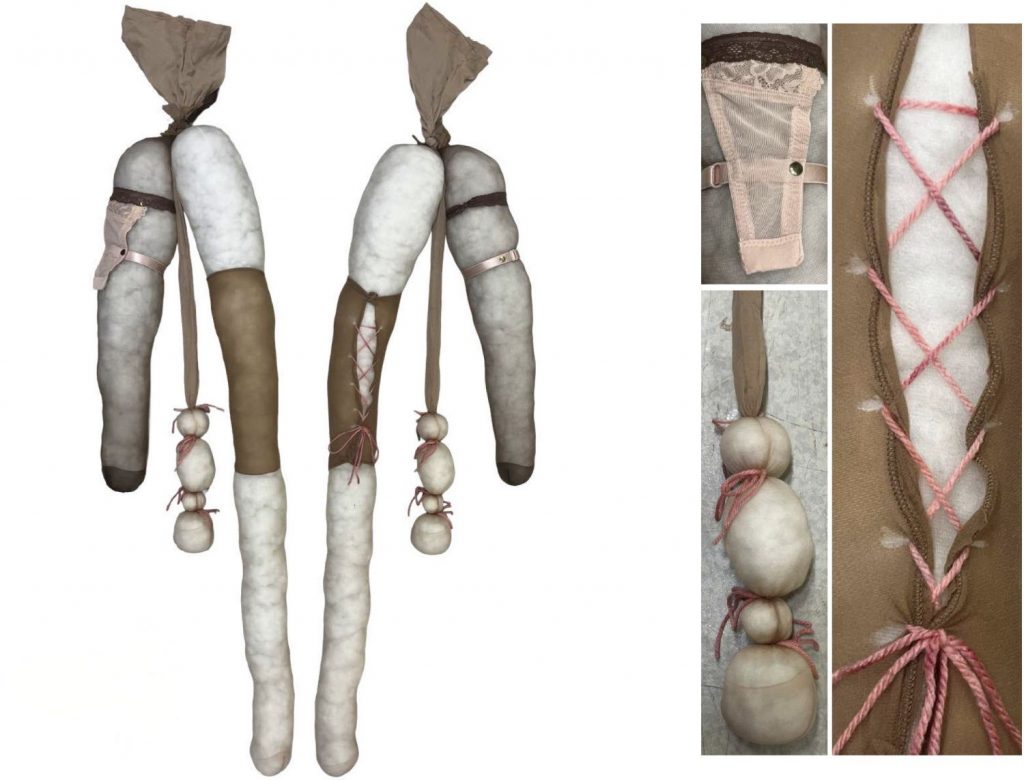 Poupées de chair, volumes (vue d’ensemble et détails) -tissu, collant, laine, 90 x 38 x 20 cm