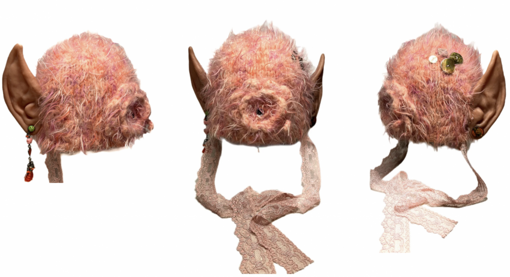 Sans titre, bonnet -oreilles en silicone, bijoux, dentelle, 28 x 25 x 25 cm
