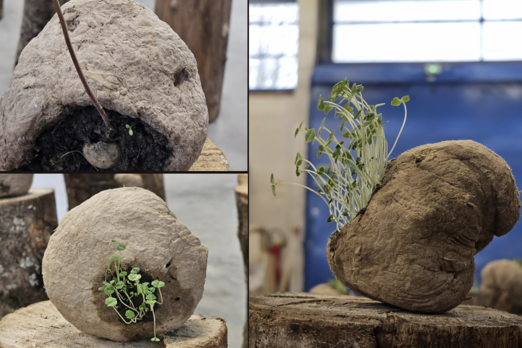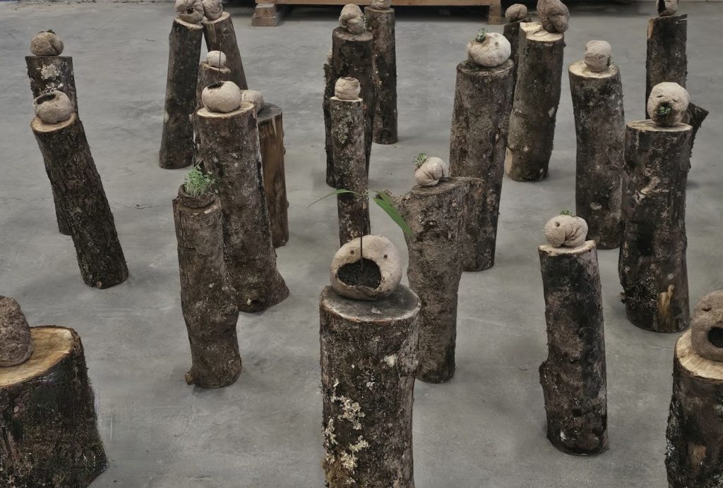 Têtes, installation circulaire -bûches, volumes carton compressé et plantes, env. 30 x 300 x 300 cm