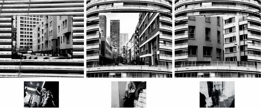 Volées à la rue, triptyque -photographies numériques, 10 x 15 cm /image, autocollants placés dans le cadre pris