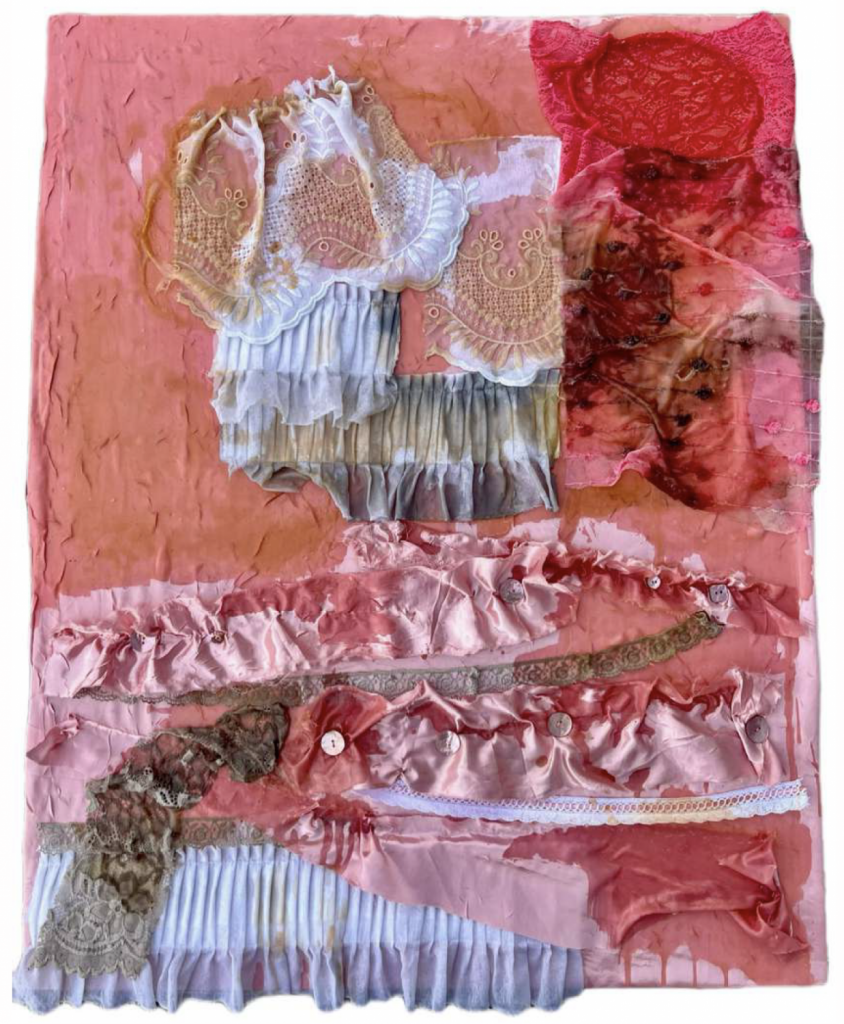 Publié le 21 décembre 202513 avril 2026 par Catherine GrasseTableau-relief Tess KONÉ-GUILLAUME Sans titre, collage sur toile contrecollée sur bois, tissus recouverts de latex, 91 x 73 x 3 cm