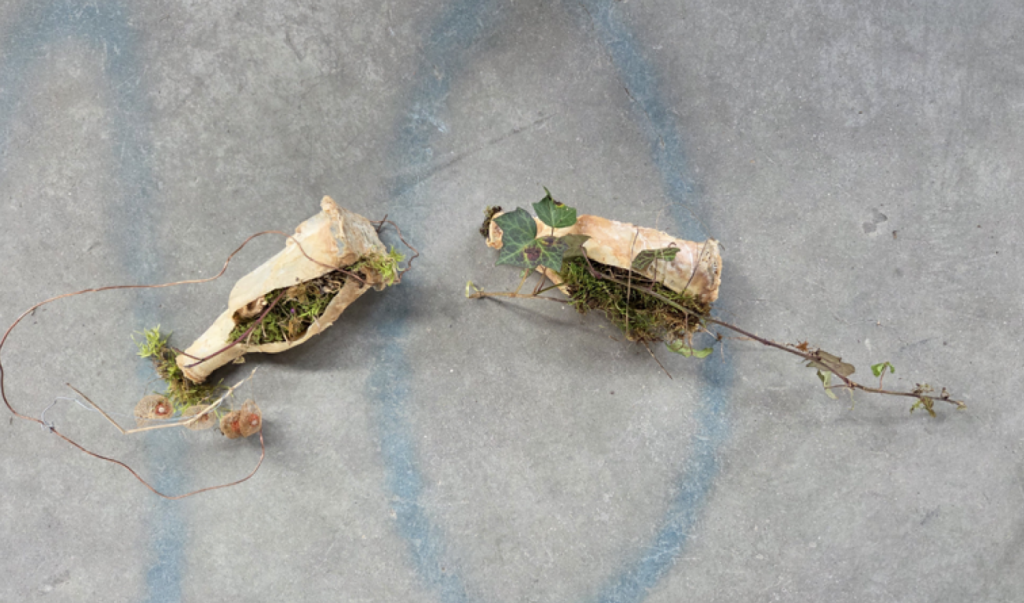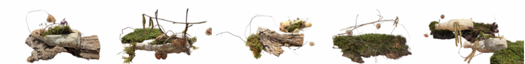 Bouteilles à la mer -Jardin d’hiver, volumes -moulages de 5 bouteilles, latex, gaze, plantes diverses, dim. variables environ 10 x 25 x 5 cm/ bouteille