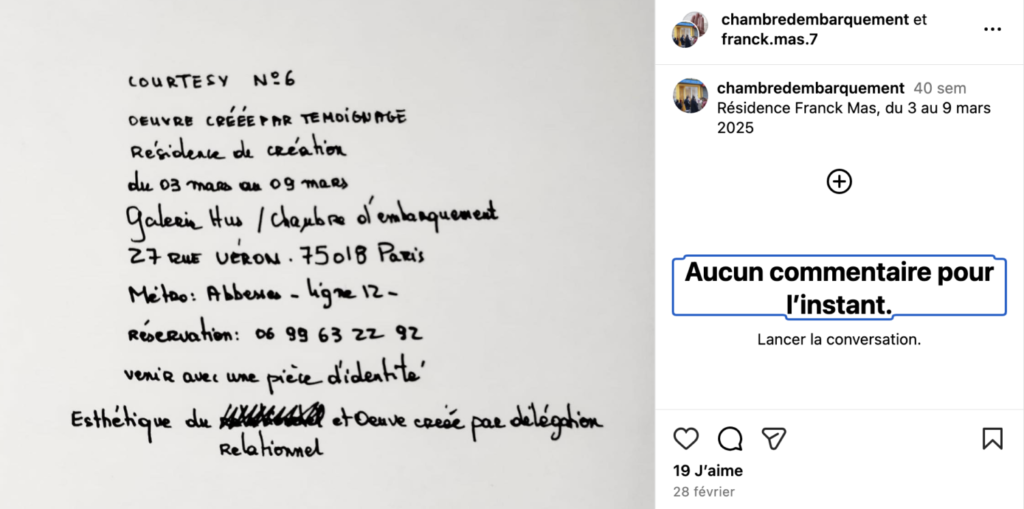 Chambre d’embarquement à la galerie HUS avec Franck MAS – 27 rue Véron 75018 Paris