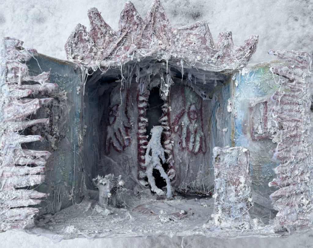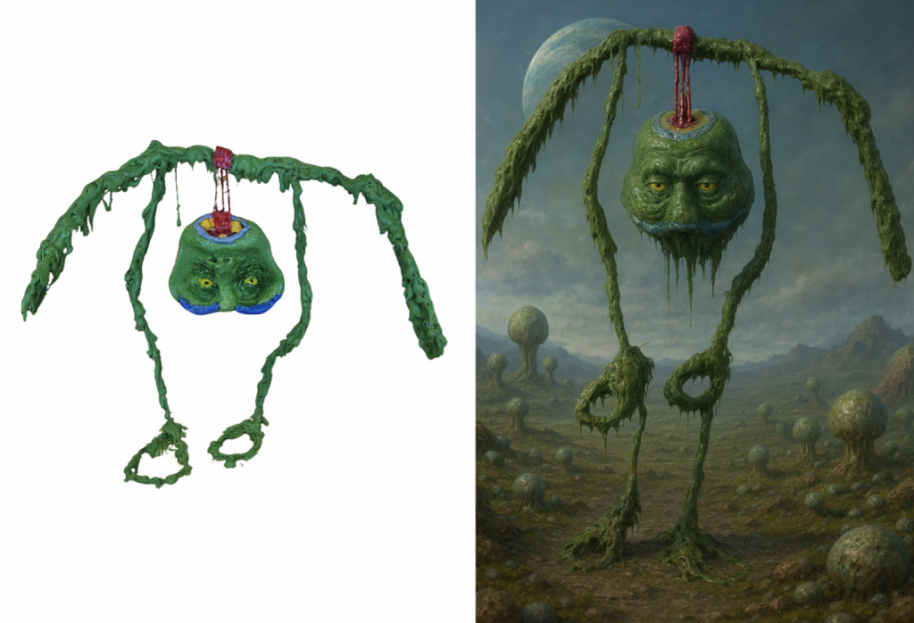 Le monstre, technique mixte, 25 x 20 x 20 cm ; image générée par l’IA, 50 x 30 cm