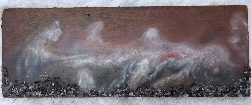 Catabase / Réunion de famille, maquette accompagnée d’une peinture. La maquette : techniques mixtes, 48 x 51 cm. La peinture, huile sur bois avec poussière, matières textiles et sel cristallisé, 16 x 43,5 cm