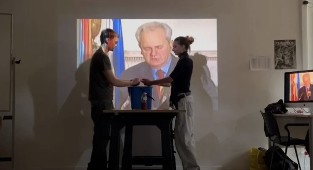 Performance réalisée avec Ivann Halleur, camarade bosniaque, moi-même d’origine serbe. Nous nous lavons les mains couvertes d’encre rouge sous un discours de Slobodan Milošević.